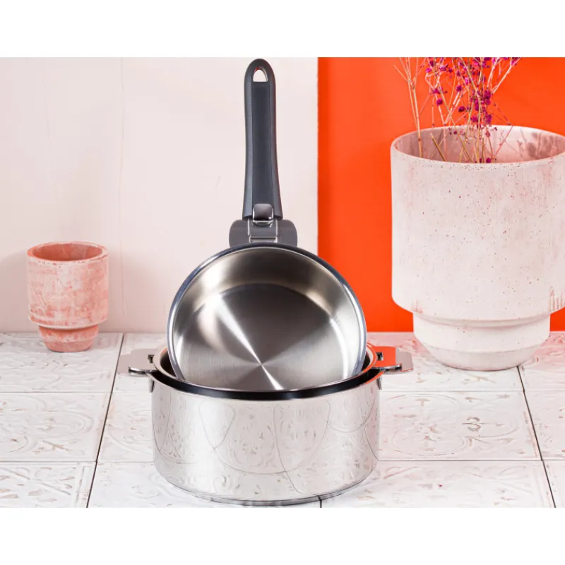 Le concept amovible de Mutine permet quant à lui un empilage parfait des casseroles et faitouts CRISTEL pour un gain de place appréciable dans les placards comme dans le lave-vaisselle. Pratique, le système de poignée amovible permet de transformer votre casserole inox en faitout en remplaçant la poignée par des anses.