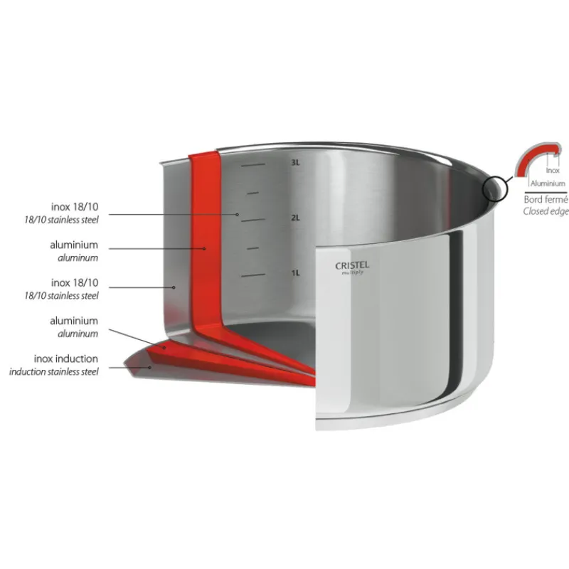 - 3-ply + Fond thermodiffuseur épais. Bord verseur fermé pour supprimer tout contact de l’aluminium avec les aliments