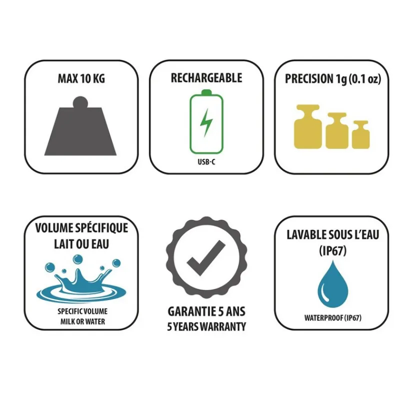 - Précision de pesée au gramme près (1 g)