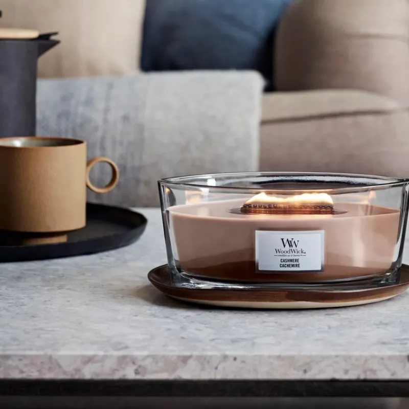 La bougie ellipse parfumée Cachemire de Woodwick embaume votre intérieur d’un parfum boisé à travers un mélange somptueux et irrésistible.