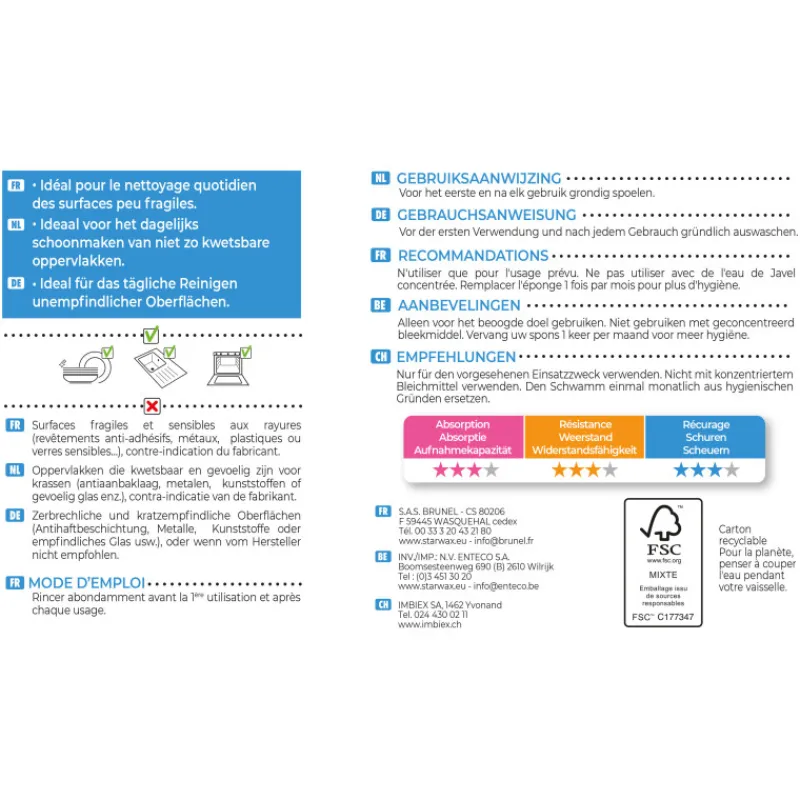 Ces éponges sont conçues avec une technologie de 3 couches, pour une meilleure efficacité au quotidien. La première couche en fibre abrasive va permettre de décoller les salissures, la seconde plus fine en mousse hydrophile, vous permettra d’avoir un confort au quotidien et la dernière couche en fibres 100% végétales vous permettra d’avoir une absorption et un essuyage efficaces.