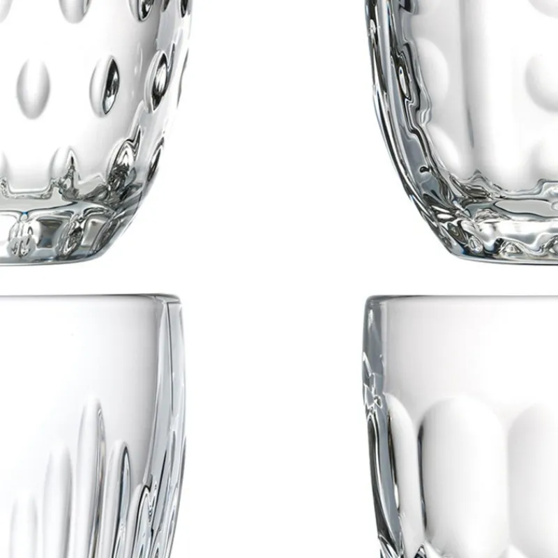 Avec quatre décors différents, les gobelets Troquet reprennent les motifs de taille de La Rochère : jeu d’orgue, facettes, géométrique et fleurs. Ainsi, chaque convive pourra retrouver son verre facilement !