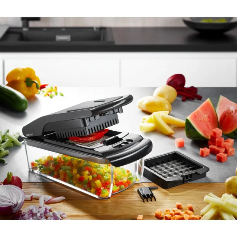 Gagner du temps sur ses découpes est toujours un plus ! Équipez-vous du coupe-dés et bâtonnets Treppo de Gefu et réalisez rapidement et sans effort des dés ou bâtonnets de légumes ou de fruits.