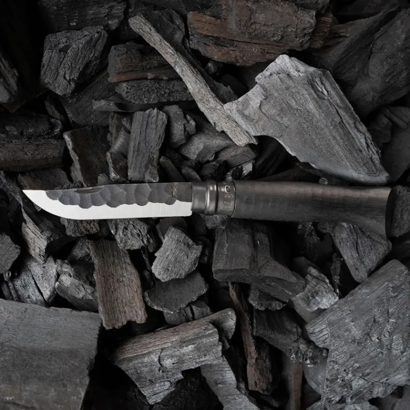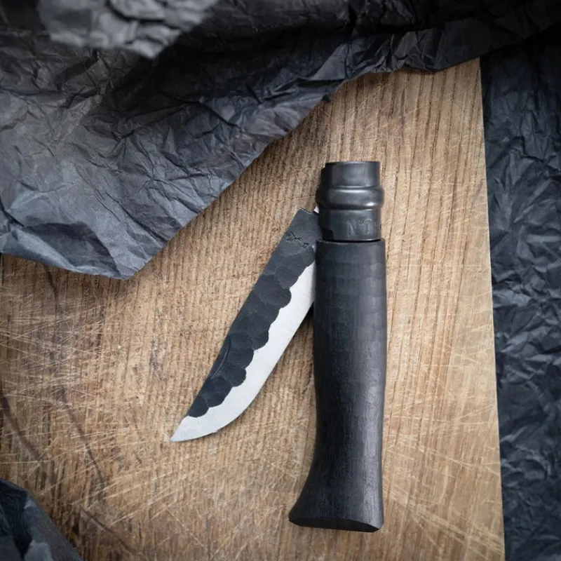 0Opinel décline son iconique couteau de poche N°8 avec une lame brute de forge en acier carbone et un manche en ébène.