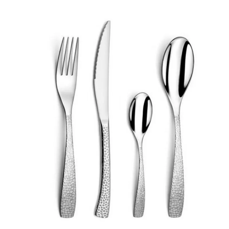 En acier monobloc, il est résistant et garanti lave-vaisselle. L’effet martelé sur les deux faces lui donne un look original et un design tendance. Le décor a un léger effet mat et brillant qui révèle toute l’élégance du couvert. Sa lame microdentée vous assure une découpe parfaite, et son manche légèrement courbé vous offre une prise en main très agréable.