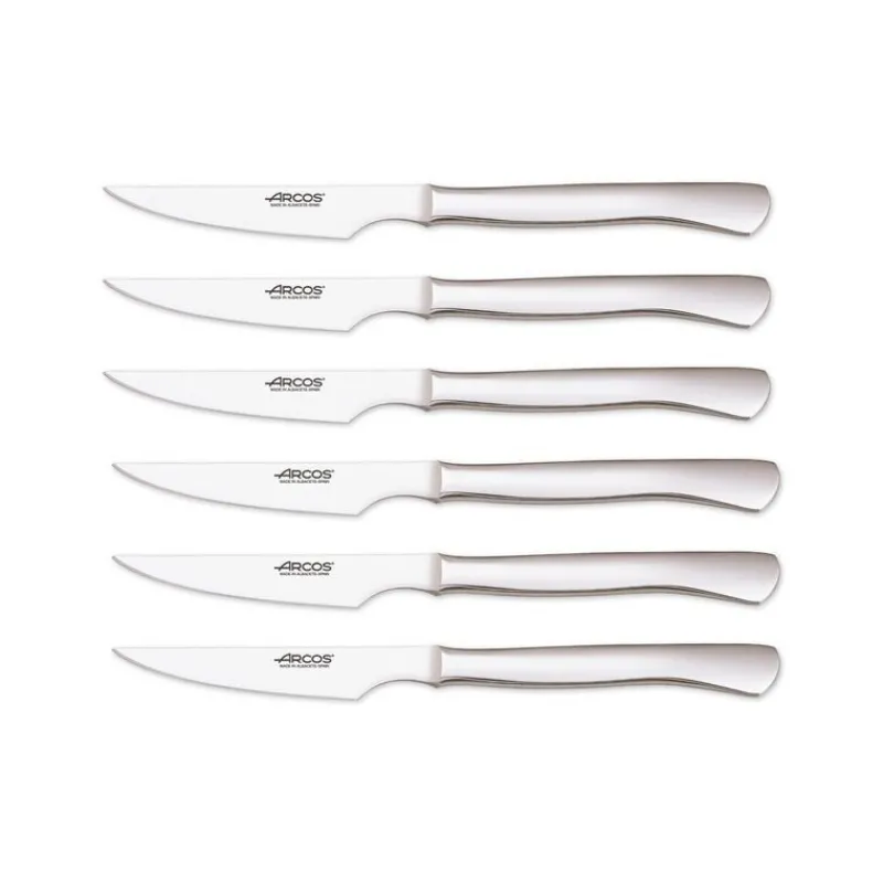Le coffret de 6 couteaux à steak à lame lisse du coutelier espagnol Arcos est le coffret idéal pour renouveler vos couverts de table. Avec sa ligne ergonomique et une qualité de coupe incomparable, le Couteau à Steak tout inox d’Arcos et sa lame lisse conviendra parfaitement à la découpe des bonnes pièces de viande que vous dégusterez chez vous.