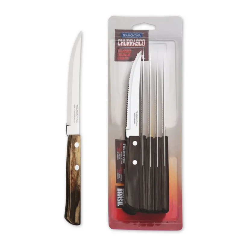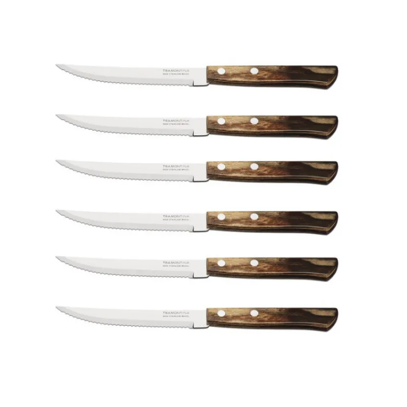 L’ensemble de couteaux à steak et pizza Churrasco est fabriqué au Brésil, où la marque Tramontina fabrique des ustensiles de découpe depuis 1911. Présenté ici en manche brun 2 rivets.