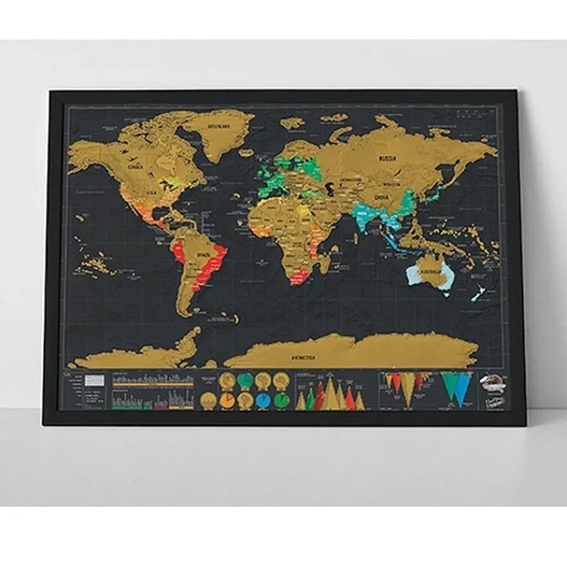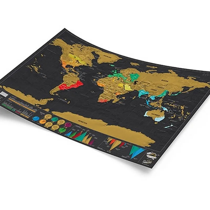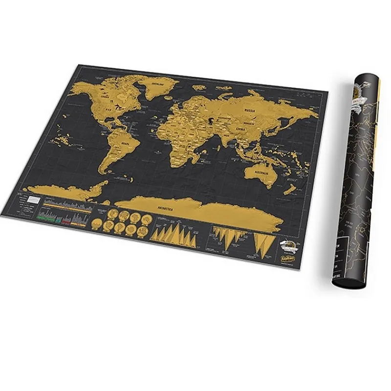 Les continents de cette carte de voyage sont recouverts d’une couche dorée à gratter. À chaque voyage effectué et nouveau pays visité, grattez-le sur la carte, il apparaîtra alors en couleurs. C’est une manière ludique de se remémorer ses souvenirs et de les partager.