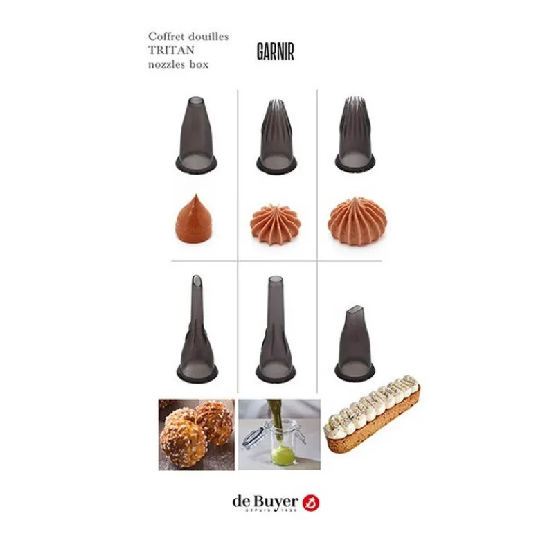 Pour réaliser vos décors et remplissages de pâtisseries, De Buyer vous propose ce coffret de 6 douilles Garnir en tritan.
