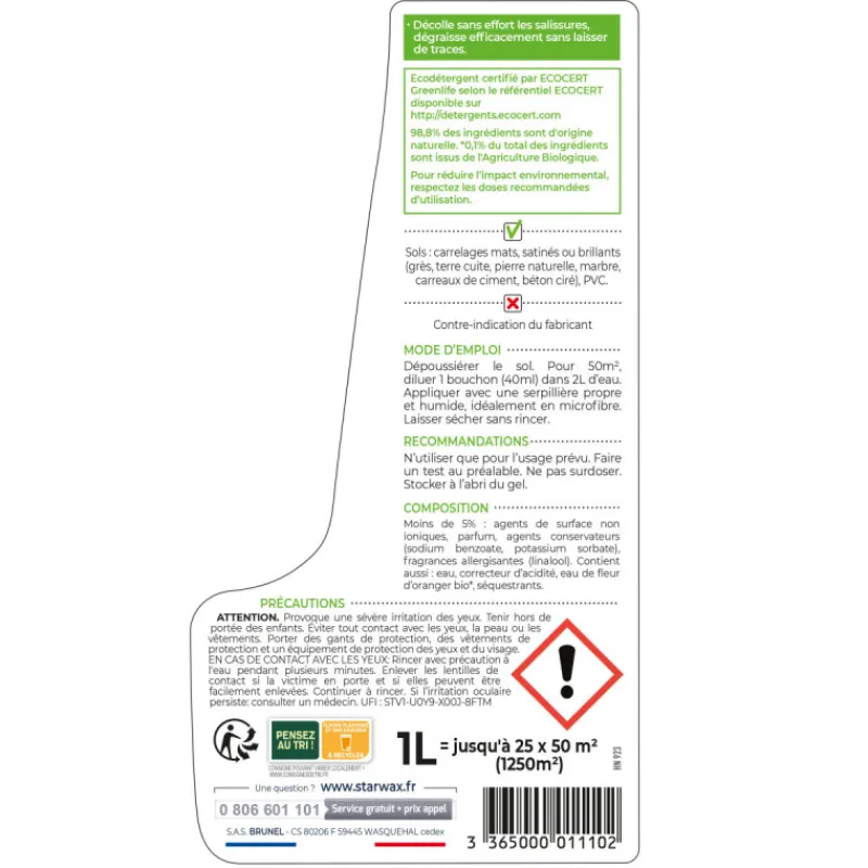 Ecodétergent certifié par ECOCERT Greenlife selon le référentiel ECOCERT disponible sur https://detergents.ecocert.com. 99,9% d’ingrédients d’origine naturelle. Pour réduire l’impact environnemental, respectez les doses recommandées d’utilisation.