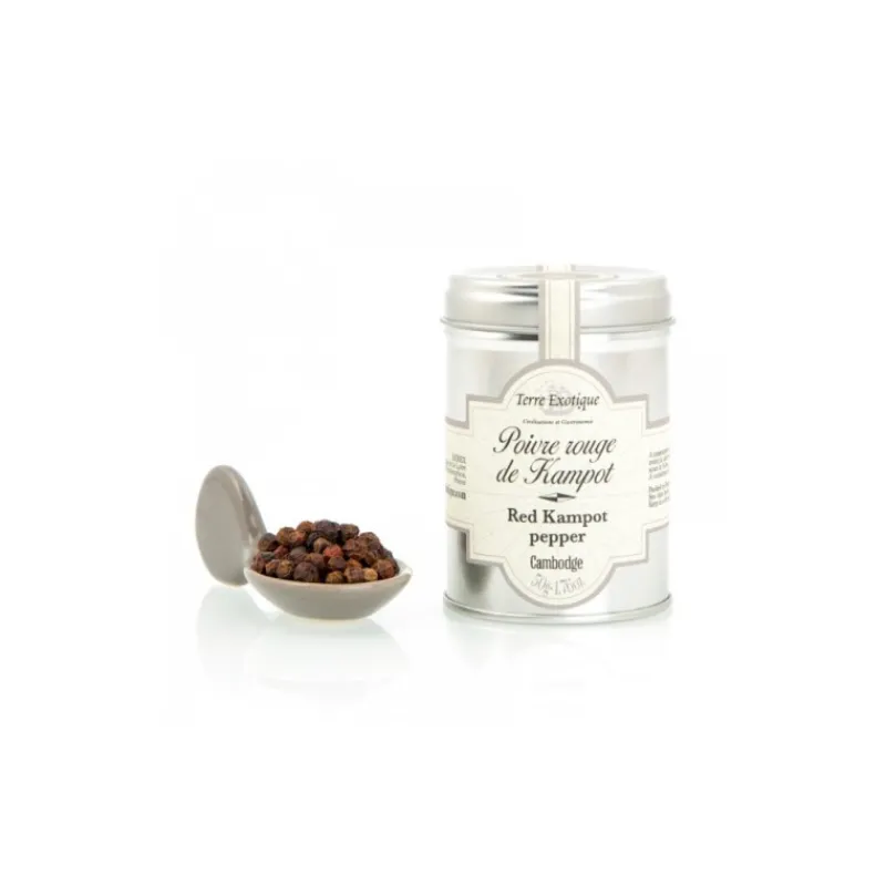 Le poivre rouge de Kampot est la baie arrivée à pleine maturité qui a été séchée pour réveler des saveurs subtiles et parfumées. Ce poivre de Terre Exotique possède une couleur rouge intense et des notes sucrées et vanillées avec un surprenant goût de citron.