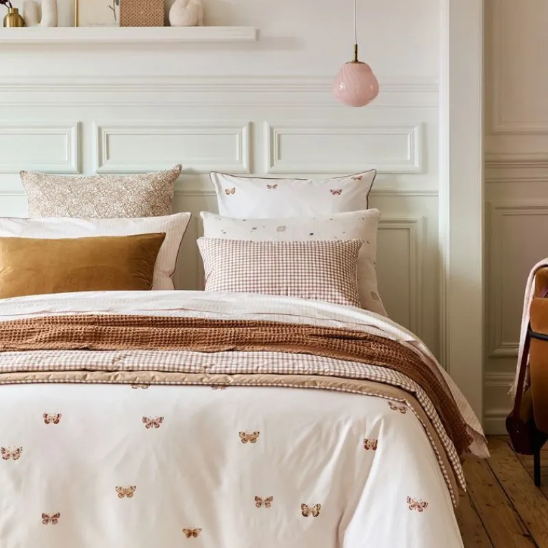 La housse de couette Délicatesse est d’une poésie incroyable ! Admirez ce ballet de papillons délicatement peints à la gouache sur une percale 100% coton.