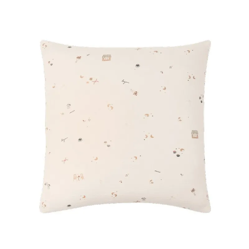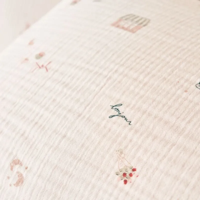 A la fois romantique et féminin, la taie d’oreiller Breakfast In Paris illumine vos matins de ses notes poudrées et de ses motifs illustrés à la main. Une collection en double gaze de coton par Essix.
