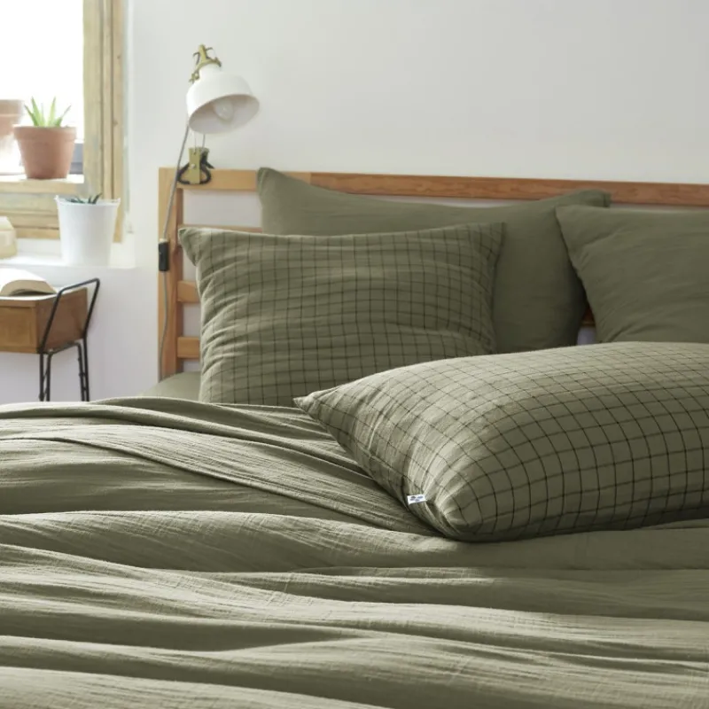 Adoptez la tendance Mix & Match dans votre chambre grâce au comptoir des taies de L’effet papillon. Découvrez ici la taie d’oreiller Gaïa Mix de L’effet papillon dans son coloris Romarin à petits carreaux.