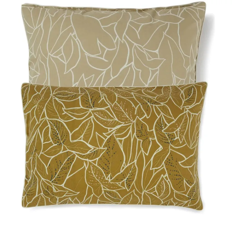 Cette taie d’oreiller jaune ambre imprimée sur un coton lavé doux et facile à vivre, est réversible s’adaptera à vos envies, le dessin de feuillages exotiques, luxuriant et généreux devient de l’autre côté épuré et organique.