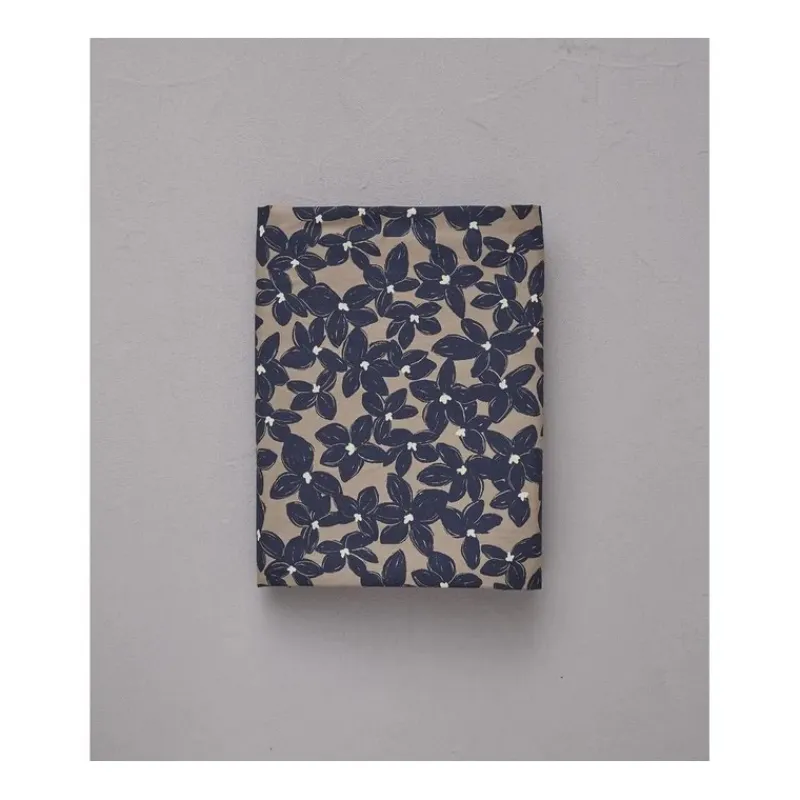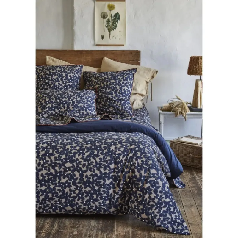 En percale de coton imprimée, la collection de linge de lit Bloem présente une face imprimée et une face unie bleu marine. Une création exclusive Sylvie Thiriez.
