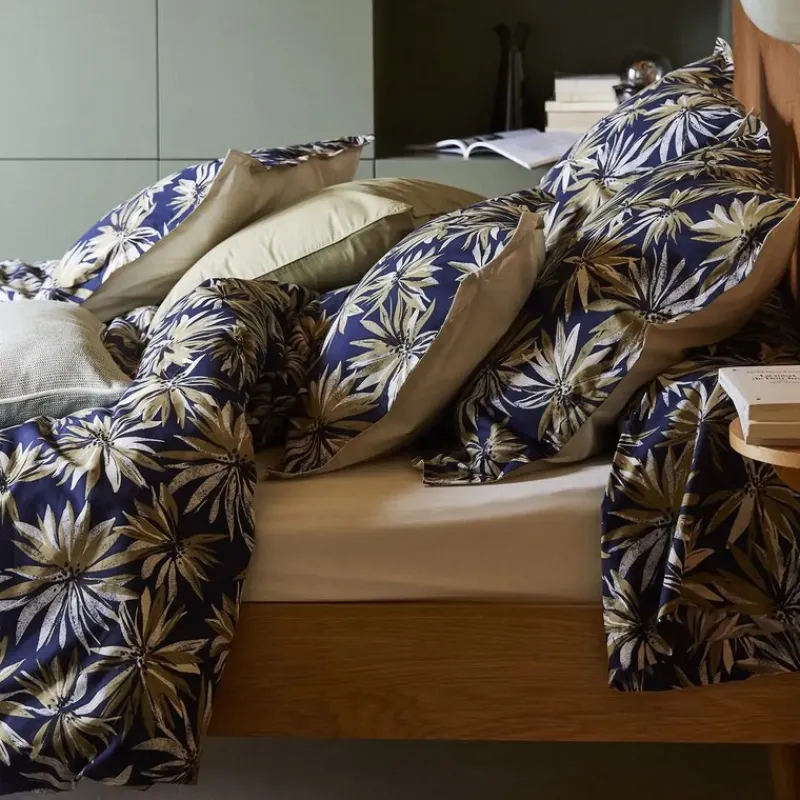 En percale de coton, la housse de couette Éverly de Sylvie Thiriez déploie son décor de pétales sur un fond Bleu Encre qui appelle au repos. Disponible en 240 x 220 cm et 260 x 240 cm.