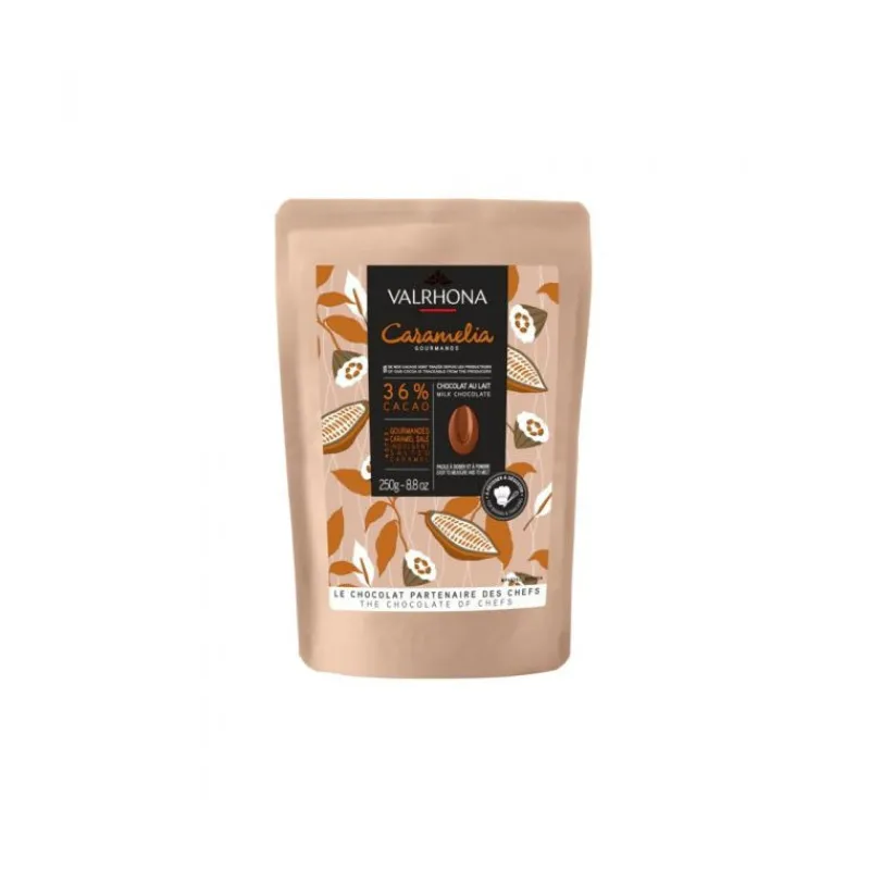 Découvrez un chocolat lait Caramélia avec une véritable identité gustative : Le chocolat de couverture lait Caramélia (36% de cacao minimum, pur beurre de cacao) de Valrhona, le chocolat partenaire des chefs.