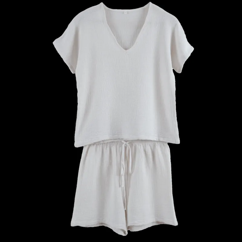 Cet ensemble short et t-shirt est conçu en gaze texturé combinant 30% de lin et 70% de coton, ce qui lui permet d’être à la fois doux, élégant et confortable au quotidien. Vous serez séduit par cet ensemble qui va vous permettre de profiter pleinement de la saison estivale et de la chaleur.