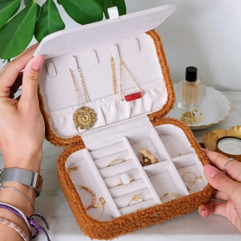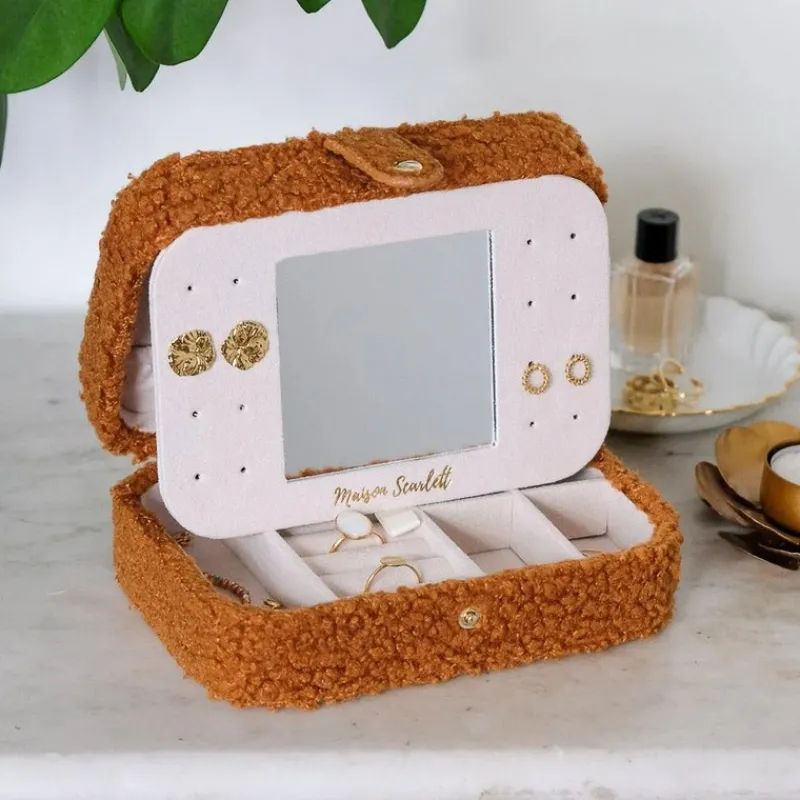 Cette Boîte à Bijoux de Voyage Brigitte Camel en Moumoute de Maison Scarlett vous accompagnera facilement dans tous vos déplacements.