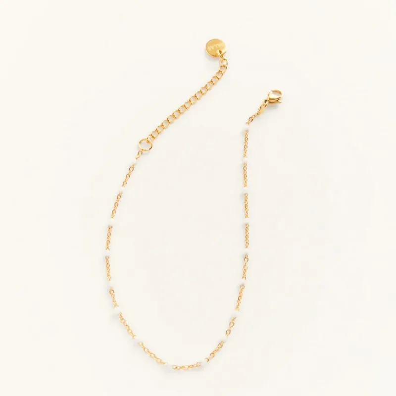 Une fine chaîne dorée agrémentée de jolies petites perles colorées, voilà la recette qui rend le bracelet Castelo blanc de Palas si adorable. En plus, il résiste à l’eau et ce bracelet est hypoallergénique, idéal pour les journées plage et farniente.