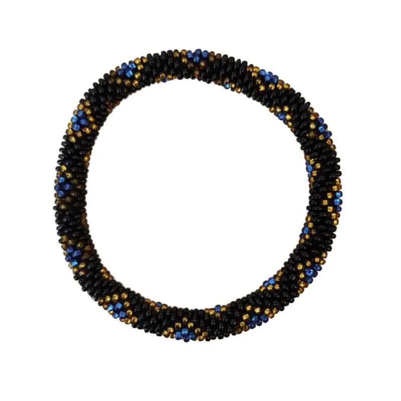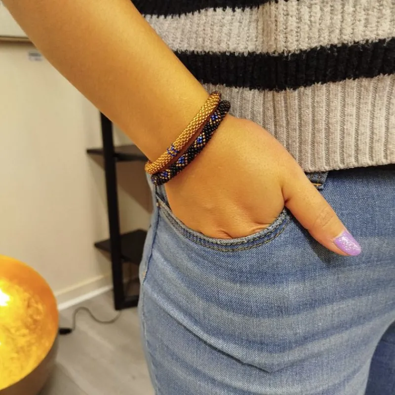 Les perles sont crochetées sur un fil résistant, ce qui leur donne leur souplesse et permet de s’adapter à tous les poignets. Pour enfiler le bracelet, il vous suffit simplement de le faire rouler sur votre poignet !