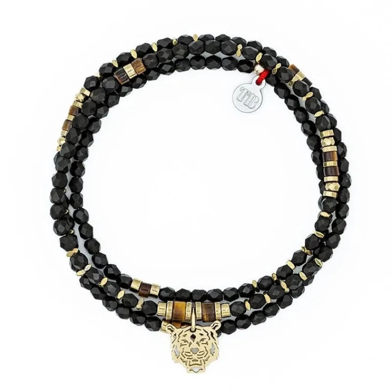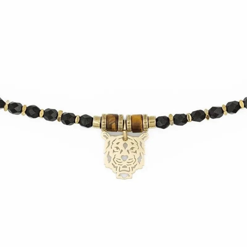 Ce bijou est composé de perles teintées dans la masse, montées sur un lien en silicone robuste. Inspiré du tigre, ce bijou est composé d’hématite gold et d’œil de tigre, qui s’intègrent à la perfection aux autres perles. Pour parfaire l’ensemble, un pendentif tigre doré à l’or fin est élégamment intégré au centre, apportant une note supplémentaire de sophistication. L’harmonie des couleurs est idéale pour sublimer vos tenues, qu’elles soient décontractées ou festives.