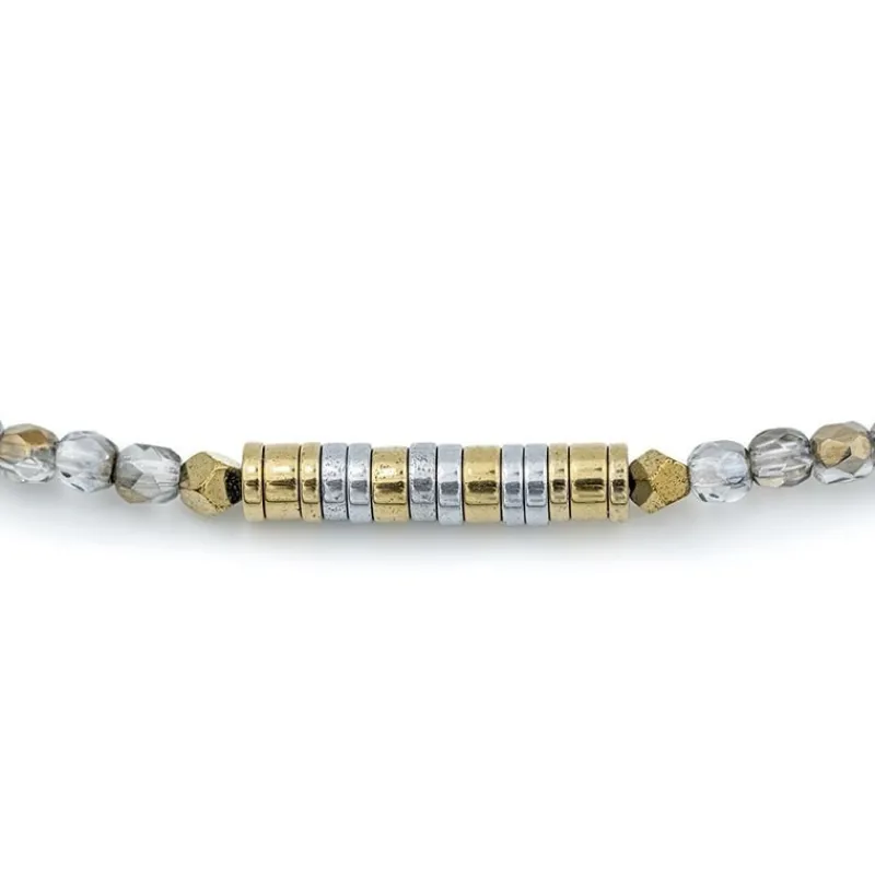 Ce bijou aux couleurs discrètes peut facilement s’intégrer à votre tenue du jour pour aller au travail ou pour faire briller votre tenue de fête. Les pointes de dorées ajouteront une belle touche brillante et élégante qui fera sensation ! Ce bijou est composé de perles de Bohème facettées et de pierres semi précieuses.