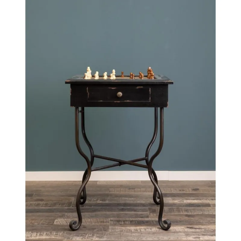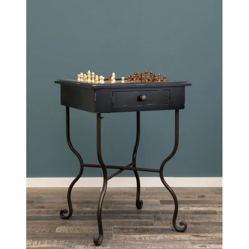 Ce sublime guéridon possède un échiquier intégré ainsi qu’un tiroir pour disposer les pièces du jeu. Les pieds en fer forgé apportent chic et élégance à la table.