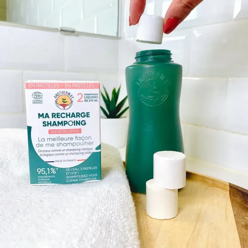 Grâce à Anotherway et son shampoing sous forme de pastilles à dissoudre, vous prenez soin de vos cheveux et de la planète. Les pastilles sont fabriquées en France à partir d’ingrédients d’origine naturelle.