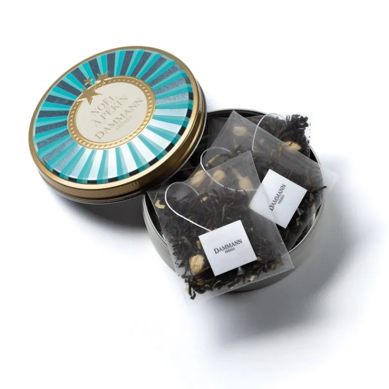 Parfaite pour des cadeaux de table gourmands, une élégante boîte de Noël en métal garnie de 6 sachets Cristal®. Une élégante attention signée Dammann Frères.