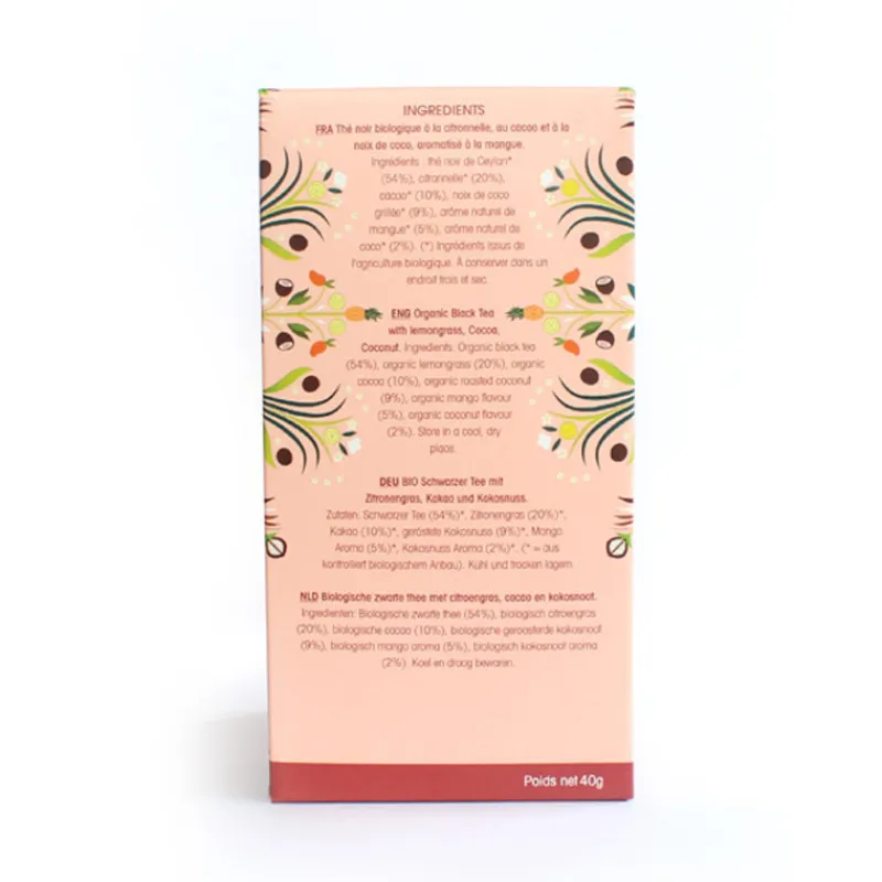 Ingrédients : thé noir de Ceylan* (54%), citronnelle* (20%), cacao* (10%), noix de coco grillée* (9%), arôme naturel de mangue* (5%), arôme naturel de coco* (2%). (*) Ingrédients issus de l’agriculture biologique.