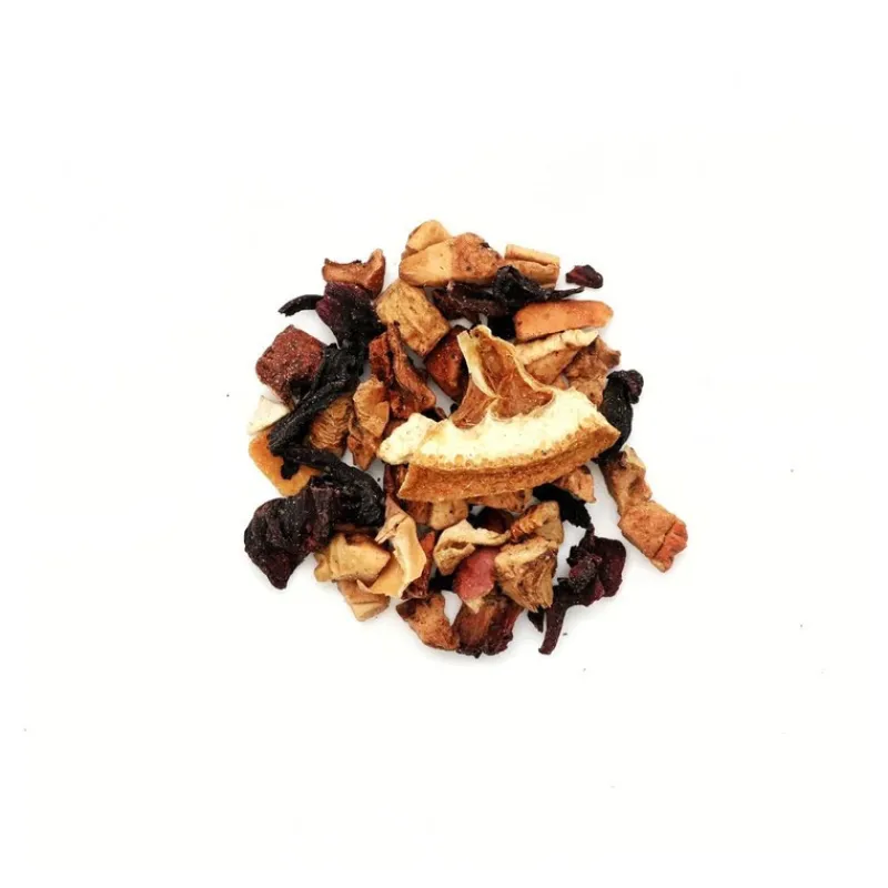 - Ingrédients : Pommes, hibiscus, écorces d’orange sanguine, arôme naturel (orange sanguine), écorces de citron, orange