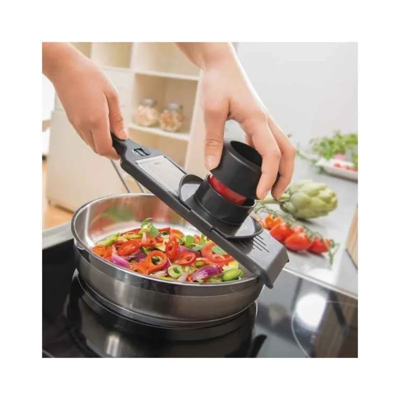 Compacte et particulièrement maniable, la mandoline Violi de GEFU se règle manuellement pour une découpe en 5 épaisseurs possibles : vos fruits et légumes n’y résisteront pas . A vous les gratins, salades de crudités et poêlées de légumes !