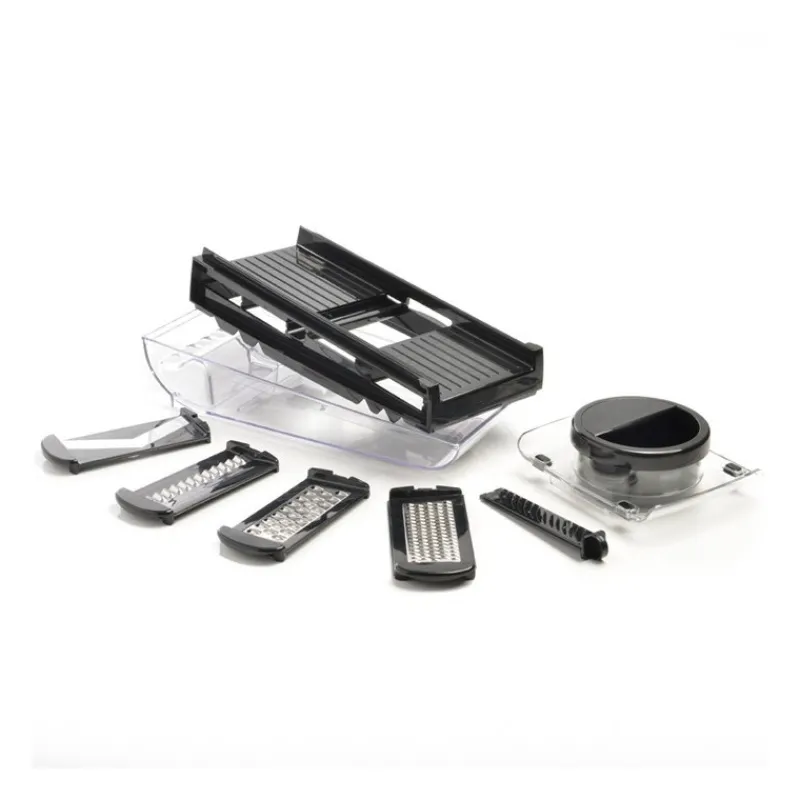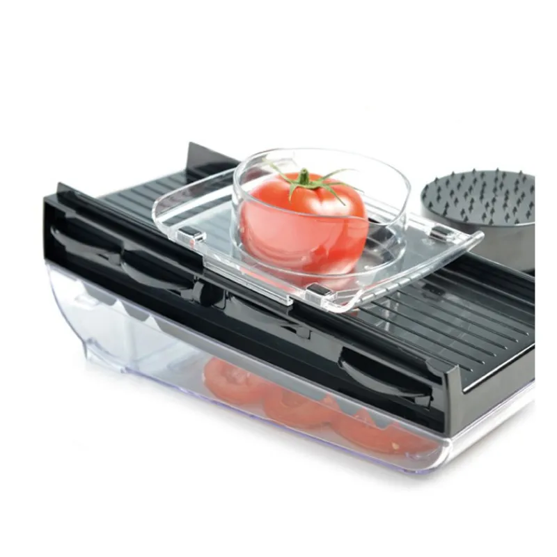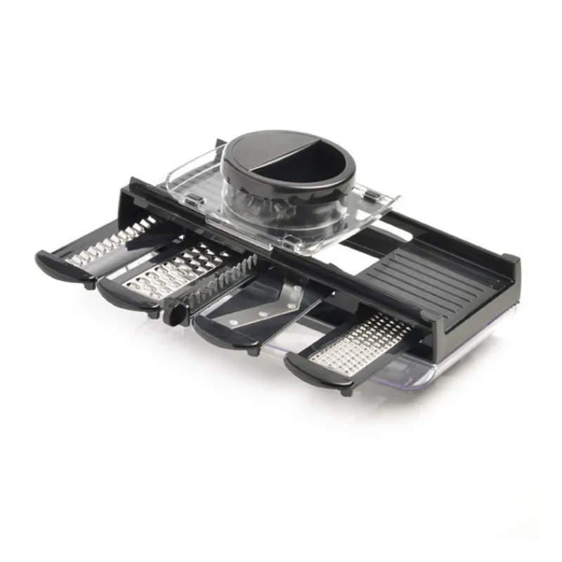 La garde agit en tant que protection additionnelle pour vos doigts. Vous pouvez donc presser et faire coulisser les aliments sur l’une des 5 lames amovibles. Par ailleurs, vous apprécierez particulièrement son poussoir, qui vous apporte encore plus de sécurité et diminue les risques de blessures.
