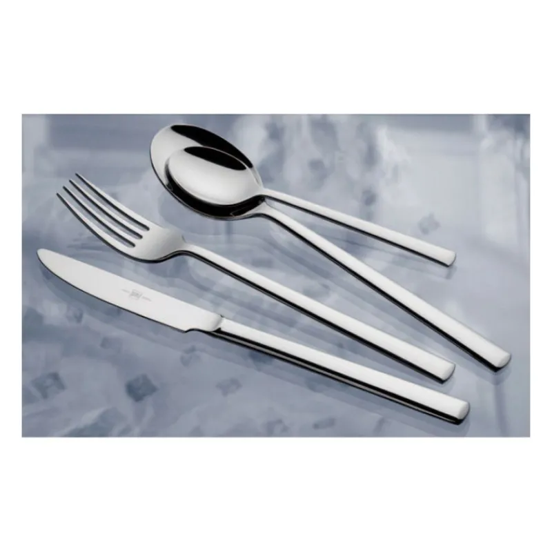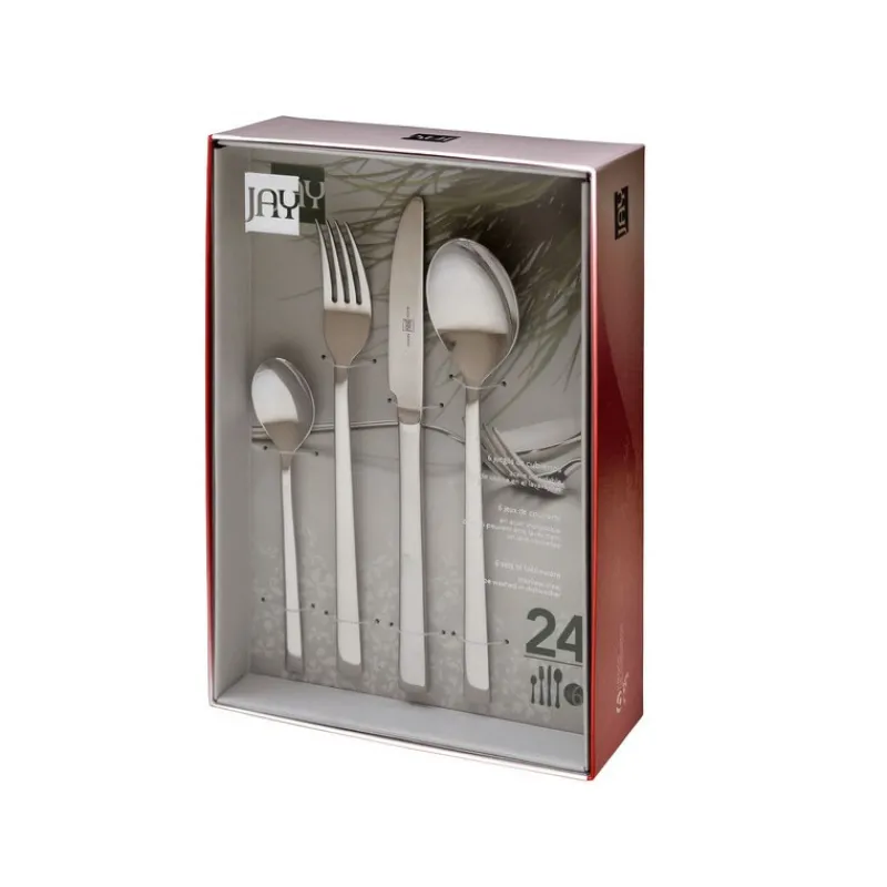 La ménagère Iris de Jay est composée de 6 fourchettes de table, 6 couteaux de table, 6 cuillères de table et 6 cuillères à café. Le design de la collection Iris conjugue le plaisir et l’élégance avec sa silhouette fine au bout très légèrement biseauté.