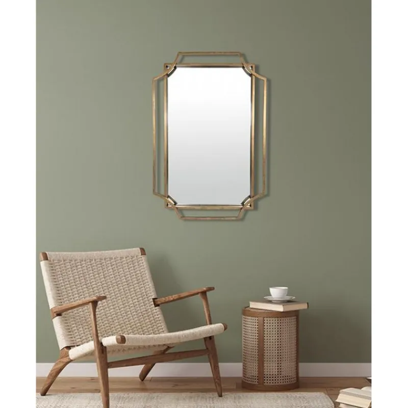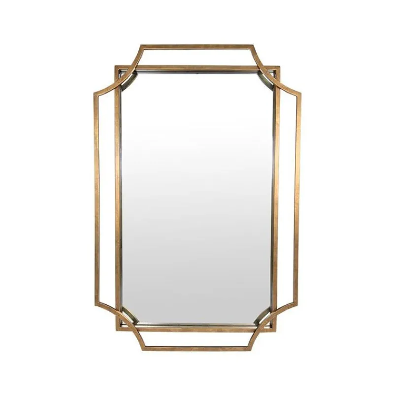 Ce miroir à un encadrement en métal doré vieilli accompagné d’un miroir en verre. Le rectangle du verre est assez vaste pour se mettre en évidence sur le mur. À cela s’ajoute les cadres métalliques imbriqués, prolongeant les contours du verre.