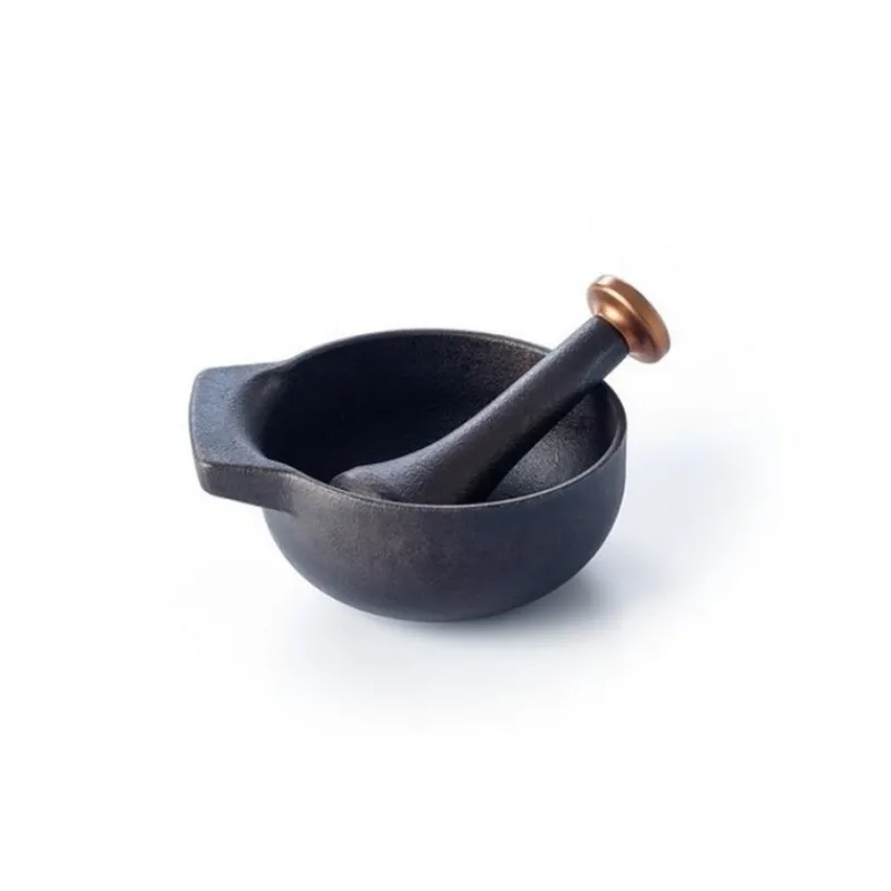 Cadeau idéal ou objet déco par l’association de la fonte noire et du bouton couleur bronze, le mortier Nori vous accompagne dans toutes vos préparations. Une finition à l’huile minérale empêche votre ustensile de rouiller.