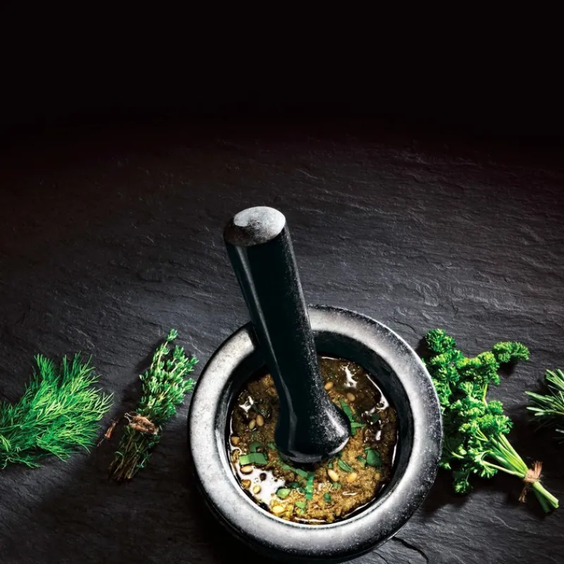 Le mortier et son pilon en granit de Cole & Mason ont été conçus pour maximiser le contact de surface entre les deux éléments, améliorant ainsi les performances de broyage et de pilonnage des herbes et des épices.