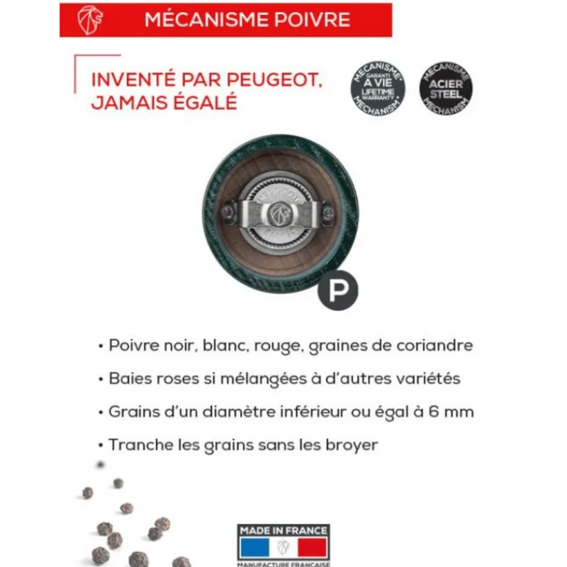 Le mécanisme garanti à vie est efficace pour moudre les poivres noirs, blancs, verts ou rouges, les baies roses (15% maxi dans un mélange de poivre) ainsi que les graines de coriandre. Le réglage de la mouture se fait à l’aide du bouton situé sur le haut du moulin et estampillé Peugeot (fond blanc et lion noir pour le moulin à poivre ). Plus la mouture est fine, plus le poivre révèle sa puissance, plus elle est grosse, plus il révèle son arôme. A ajuster selon vos goûts et vos préparations du jour !