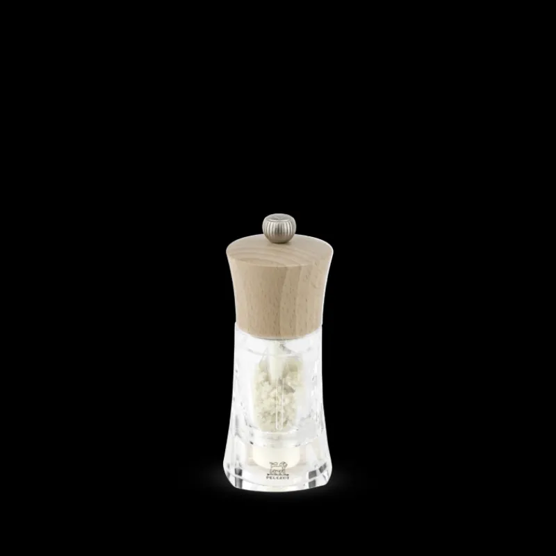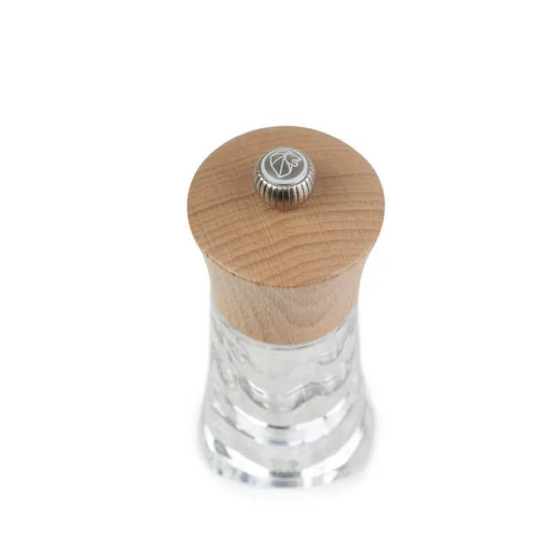 Moulin Oléron manuel en bois naturel et acryl de Peugeot, un éveil des sens tout en transparence associé à une tête en bois a été étudié pour moudre facilement et durablement le sel de mer humide comme par exemple le sel de Guérande.