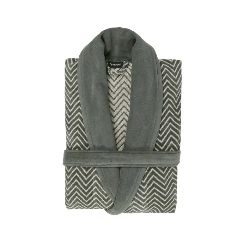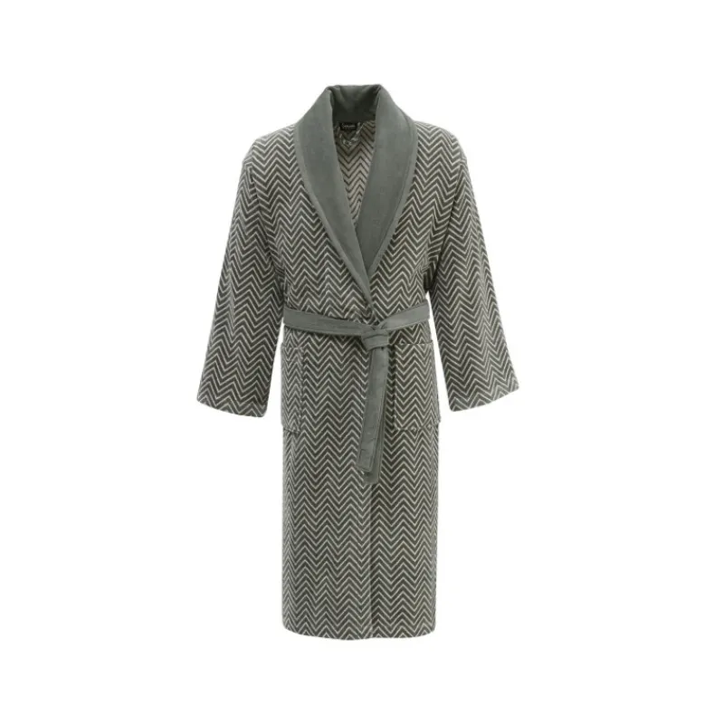 Le peignoir mixte Lentkhi de Sensei en velours, avec des motifs tissés jacquard et des tons vert eucalyptus et beige clair, est idéal lors de la sortie de douche et parfait pour un séchage optimal.