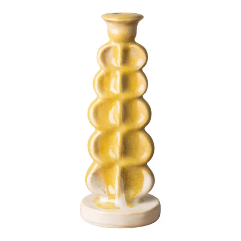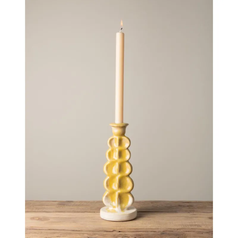 Ce porte-bougie chaleureux est fabriqué en céramique avec un très bel émaillage dans des nuances de jaune doré. Il donnera instantanément du caractère à la pièce que cela soit avec une bougie flambeau ou seul. Placez-le sur une étagère, une table ou un rebord de fenêtre, pour un éclairage tamisé ou simplement en objet de décoration.
