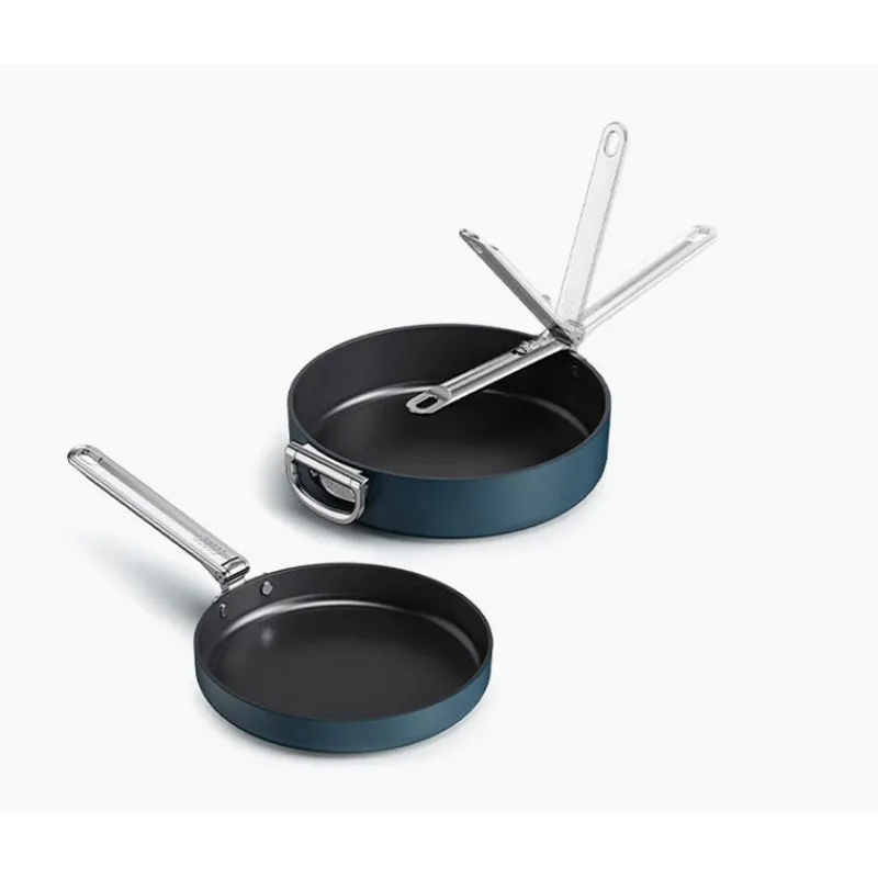 Cette collection de poêles et casseroles fabriquées avec précision et dotées de poignées pliantes innovantes, est conçue pour vous faire gagner jusqu’à 50 % d’espace. Nos cuisines ne sont pas extensibles et avoir des ustensiles de qualité permettant d’économiser l’espace est une véritable solution.