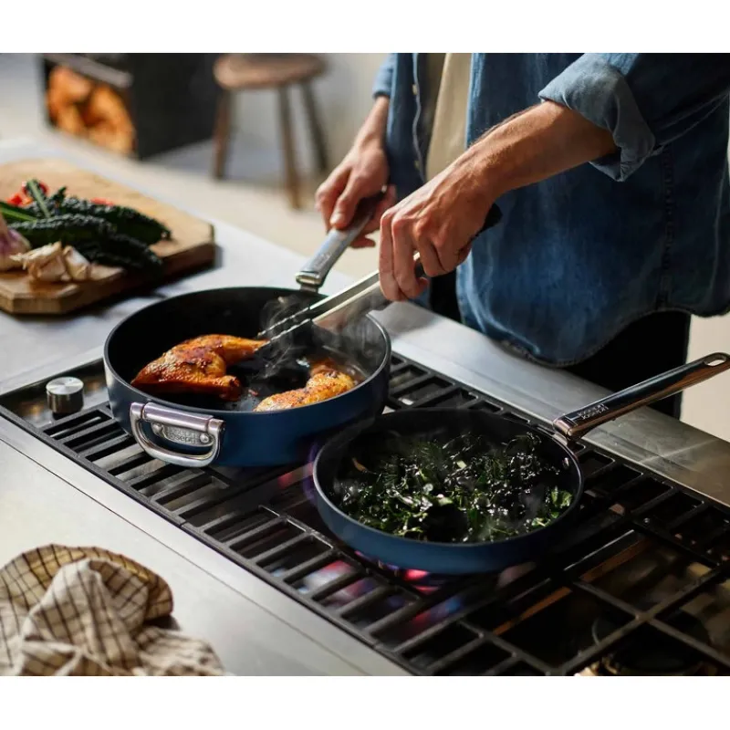 Comme le dit tout haut, Joseph Joseph : Toutes les casseroles ne se valent pas. La marque présente donc Space, sa gamme révolutionnaire d’ustensiles de cuisine de qualité professionnelle, en bleu nuit. Joseph Joseph a développé un set de 2 poêles dont les atouts sont :