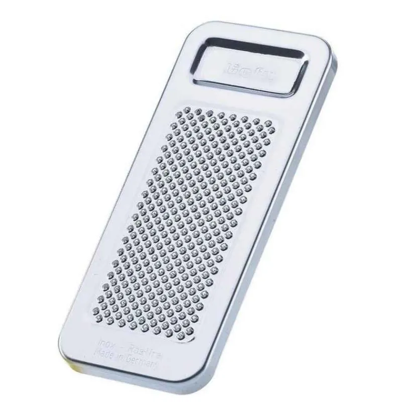 La marque allemande Gefu s’adresse à tous les amateurs de cuisine pour qui passion ne rime pas forcément avec complication. Elle crée ainsi des ustensiles haut de gamme alliant fonctionnalité et qualité, pour vous offrir un usage simple vous libérant au maximum des contraintes. La râpe citron épices appartient à la série de râpes longues et étroites « La Linea », spécialement conçue pour une prise en main parfaite avec des bords recourbés qui permettent de la poser aisément sur un récipient. Fabriquée en inox solide, elle possède des petites dents très tranchantes obtenues grâce à la technologie « Laser Cut ». Pas besoin de forcer, elle s’attaquera aisément aux écorces sans déchirer les aliment, préservant leur arôme et vous permettant d’obtenir un résultat très fin. Hygiénique et pratique, elle supporte le lave-vaisselle pour un nettoyage en toute simplicité. Design, robuste et fonctionnelle, cette râpe est une valeur sûre pour tous les cuisiniers, qu’ils soient novices ou confirmés.