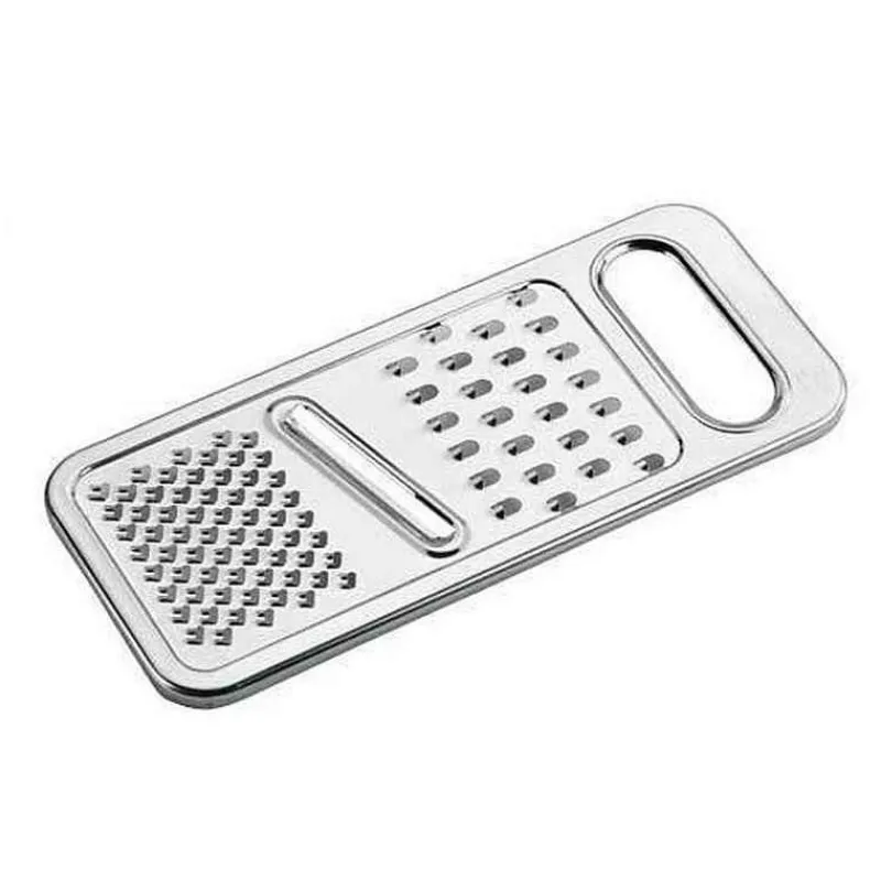 Cette râpe multifonctions permet de réaliser des coupes nettes et régulières pour râper parfaitement fruits et légumes, fromages à pâte dure, chocolat, etc. Dotée d’une large poignée ergonomique, elle offre une excellente prise en main pour limiter au maximum les efforts, et elle possède des bords recourbés qui lui confèrent une bonne stabilité, vous pouvez ainsi la poser à plat sur un récipient en toute sécurité. Vous serez agréablement surpris par le tranchant de ses dents : obtenu par la technologie « Laser Cut », il permet de couper les aliments aisément sans les écraser. Fabriquée en acier inoxydable de qualité, cette râpe est hygiénique, sans odeur et sans goût, et elle passe au lave-vaisselle pour un entretien parfait. Grâce à cet ustensile de qualité, vous pourrez râper et émincer sans souci et pour longtemps.
