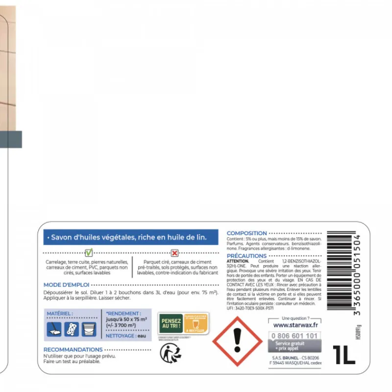 Ce Savon noir à l’huile de lin de Starwax vous permettra de laver et entretenir les sols plastiques, carrelages, marbre, surfaces laquées et émaillées.