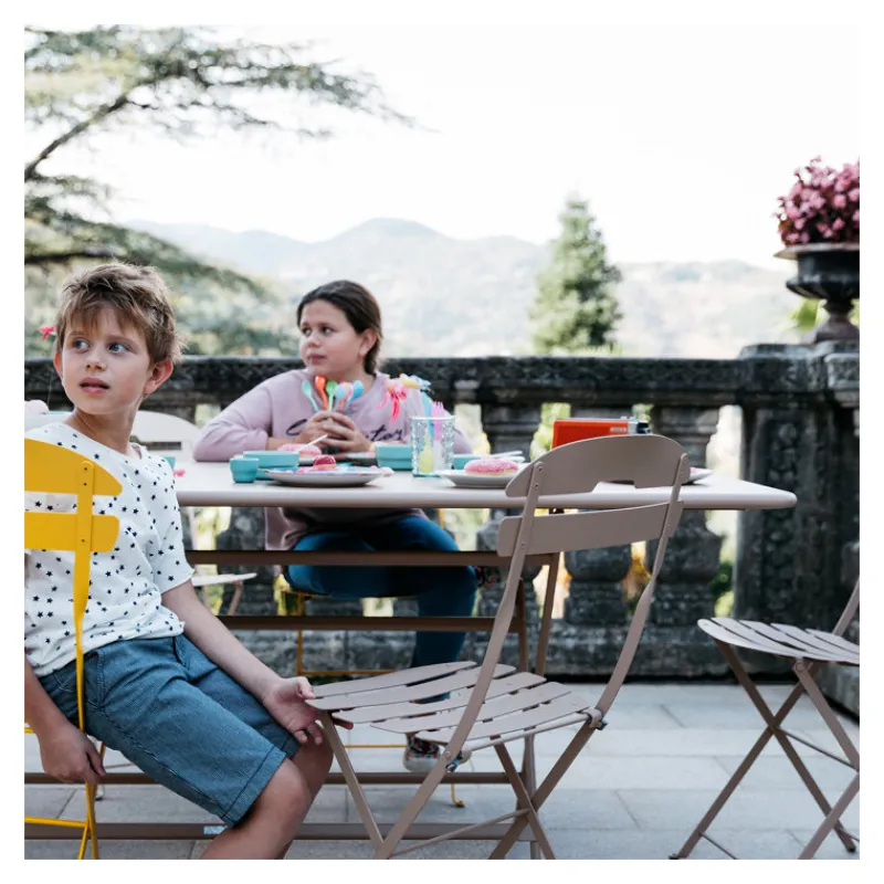 Caractère se déploie (et se replie) en un tour de main. Cette table en métal de 90 x 190 cm accueille jusqu’à 8/10 personnes, son piétement central évite toute entrave pour les jambes. Autre atout de poids, sa légèreté (30 kg, un record pour une table de jardin en acier de cette dimension !). Conjuguer solidité, stabilité et élégance, telles sont les prouesses techniques dont est capable Fermob avec cette table pliante de grande dimension. Son plateau bénéficie également d’un traitement très haute protection ce qui la rend particulièrement résistante. Se combinant à de nombreux styles de chaises (comme les chaises en métal Bistro ou La Môme par exemple), elle peut pleinement affirmer son… caractère ! A découvrir dans toutes les couleurs du nuancier Fermob.