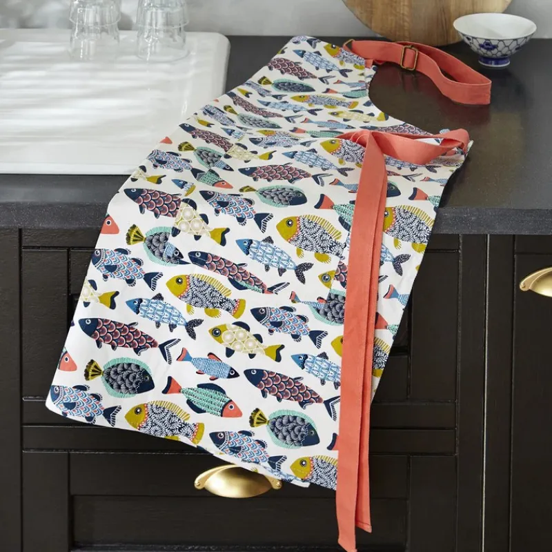 Ce joli banc de poissons vous protègera des tâches et des éclaboussures ! Coloré et joyeux, le tablier en coton Aquarium de la marque irlandaise Ulster Weavers vous permettra de préparer vos plats préférés avec fantaisie.
